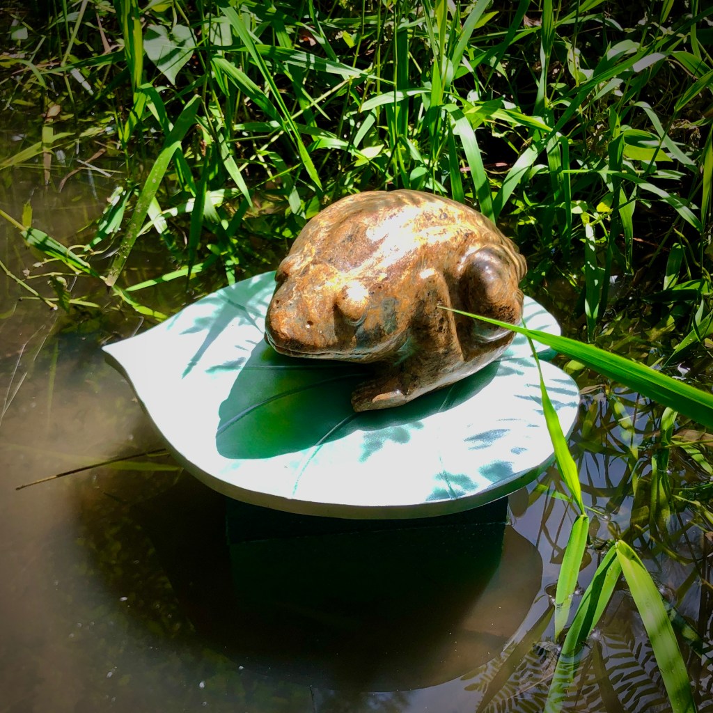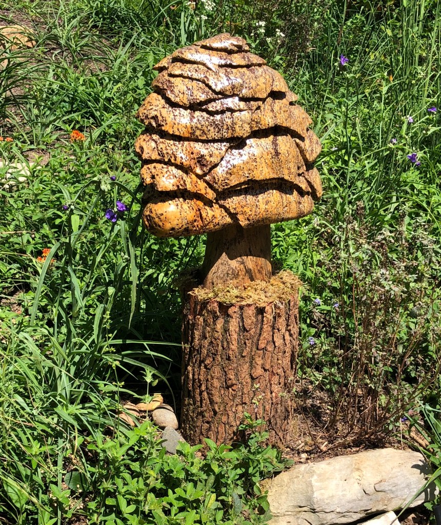 On Display at the North Carolina Botanical Garden (Sculpture in the Garden), Chapel Hill NC. CALAVERAS STREAMLINER. Sierra Steatite, Aluminum.